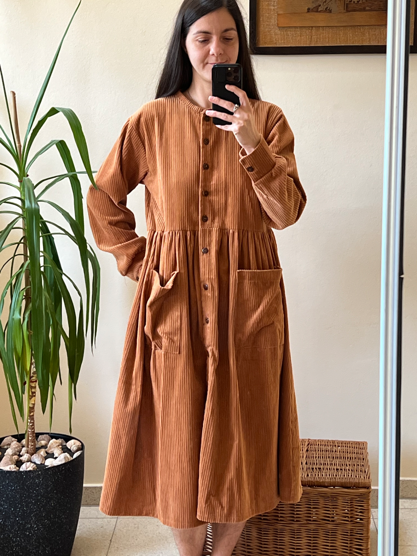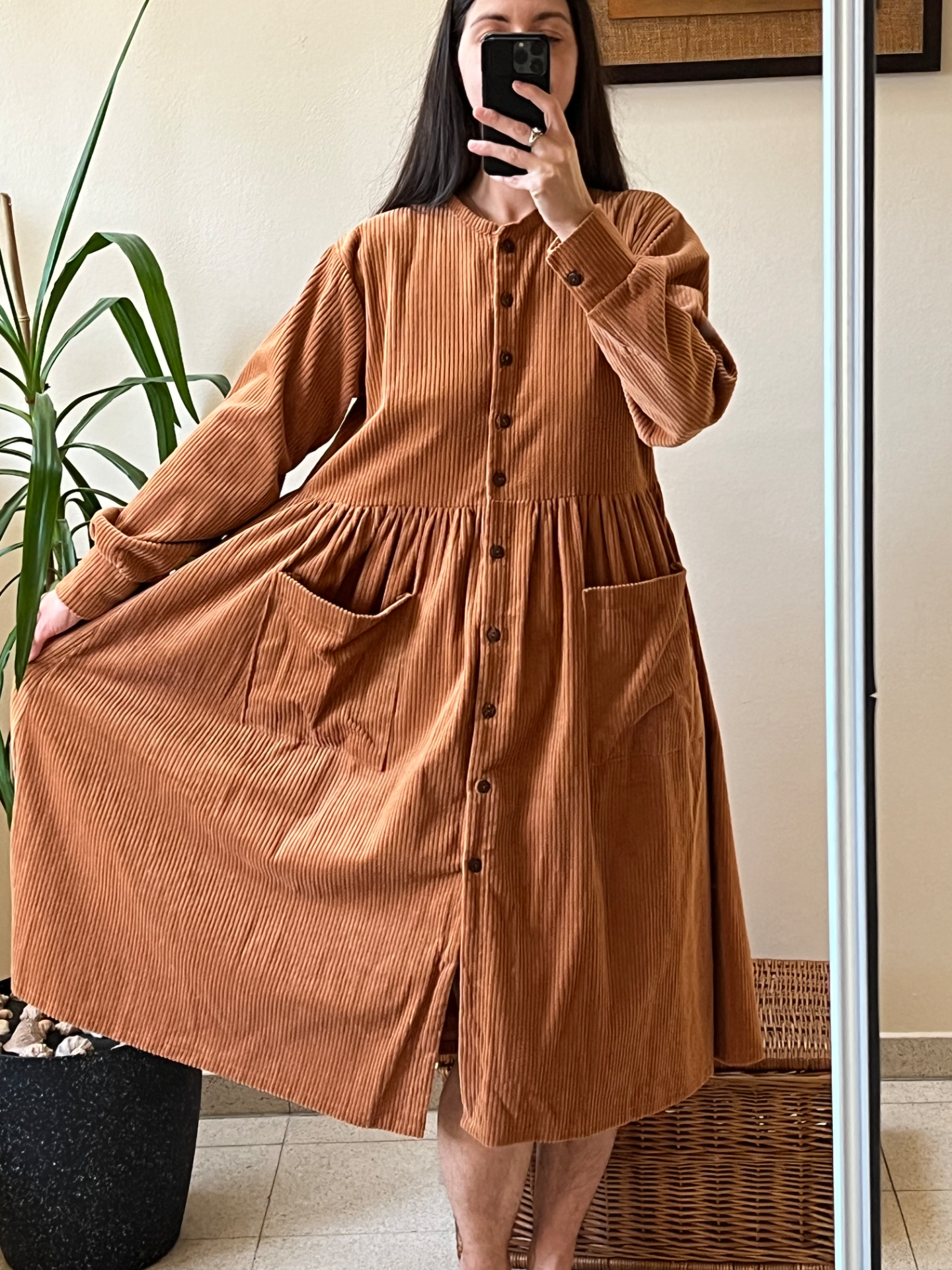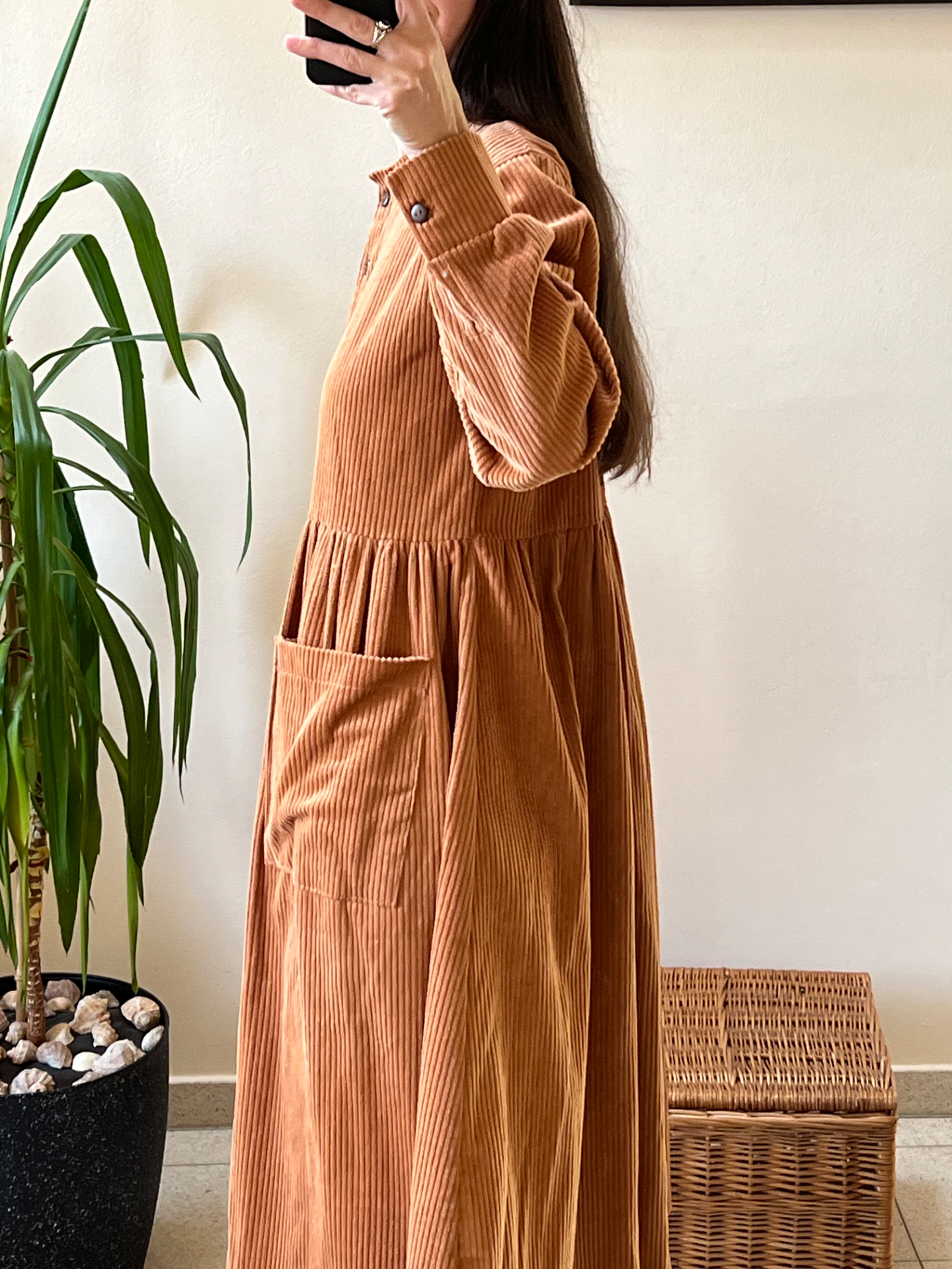 Prototyp šiat, ktoré sa nestihli dostať do predaja. Neprané a nenosené. Sú šité z bavlneného menčestru vo farbe karamelovej. Šaty sú dosť veľké, vhodnejšie skôr pre väčšie. konf. čísla M a viac.